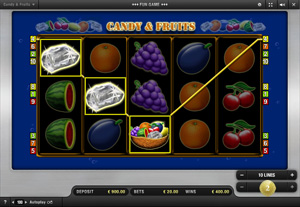 Mit einer Auswahl an Kirschen, Melonen oder Weintrauben habt Ihr nur einen Bruchteil der Früchte in diesem Slot kennen gelernt, die Euch Glück und Gewinne bereiten können. Egal welche Früchte Ihr als Symbole auf den Walzen erhaltet, Candy und Fruits ist ein sehr lukratives Spiel. Und wie der Name schon beschreibt, darf natürlich nicht das Süßigkeiten- oder auch Candy-Symbol fehlen. Wer gleich von Beginn an hoch hinaus möchte, sollte sich stets für die gesamten 10 Gewinnlinien entscheiden und mindestens 10 Cent pro Runde setzen. Je mehr Ihr im Spiel setzt, desto höher werden natürlich auch Eure Gewinnmöglichkeiten. Falls Ihr also etwas mehr riskieren möchtet, dann lasst Euren Einsatz stetig ansteigen.
